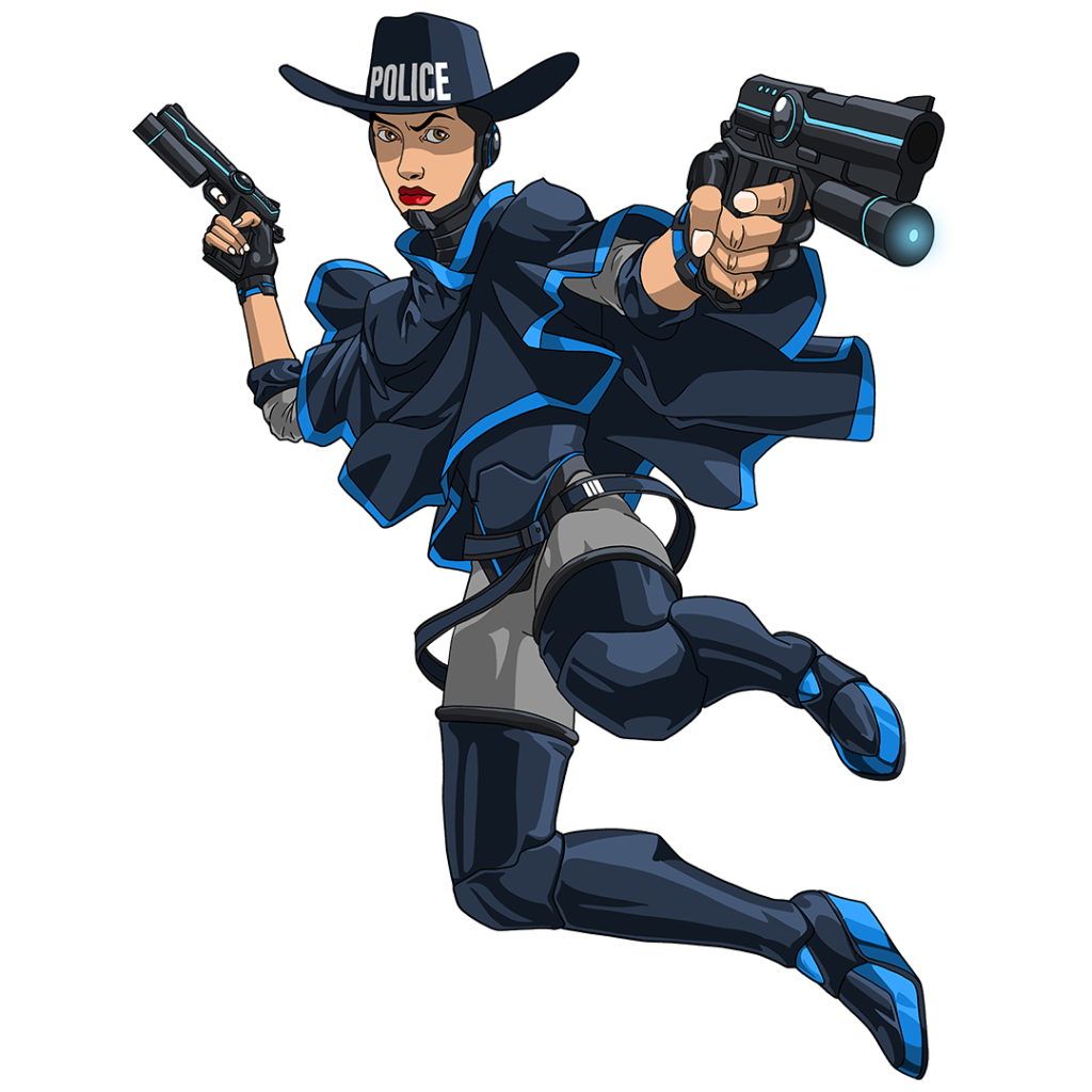 Abilities: Sheriff possesses a formidable combination of heightened reflexes, peak agility, and unmatched marksmanship. A certified tactical technology genius, she wears a highly advanced Tactical Armor System. This unified platform includes an integrated command helmet that acts as her high-tech targeting and threat-assessment system. The armor also powers her main weapons: a variety of automated drone weaponry, including sidearms and rifles. She can command these weapons to fly and fire independently, creating a formidable battle situation where an opponent must face her and her flying guns simultaneously. Her marksmanship is so precise that she currently holds the record for the best distance with a high-powered rifle.